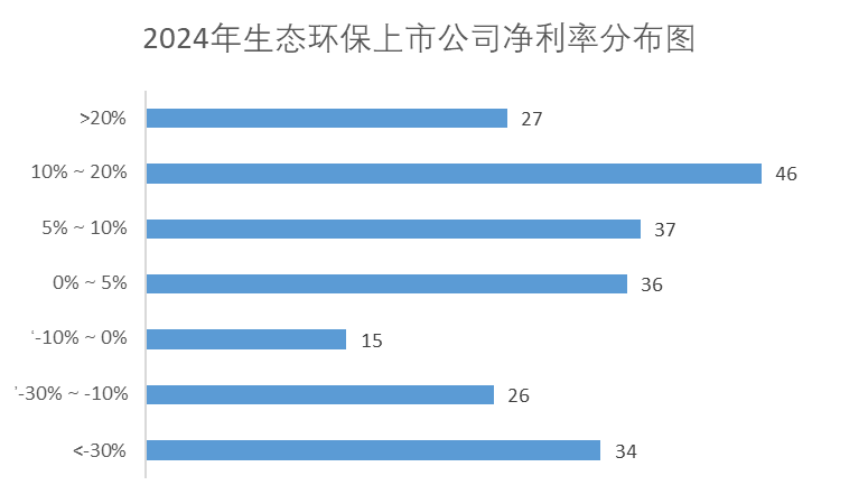 盈利的环保上市公司有146家,占比66%,亏损的有75家,占比34%,也就是说,大约三分之一的环保企业不挣钱。看起来,这个比例很高,但全部A股及港股上市公司中,2024年2573家亏损,占比约为32%。环保行业的整体盈利比例处于平均线,算不上好,也算不上差。2023年,生态环保行业的上市公司盈利占比为72%,亏损占比为28%,2024年的亏损占比扩大了6个百分点,这意味着2024年有相当部分环保企业从盈利状态转向亏损:这一准确数据是21家,即有10%的生态环保上市公司业绩“变脸”。同时,还有8家企业成功的实现了扭亏为盈,分别是:山高环能、津膜科技、深水规院、德创环保、大千生态、力源科技、万邦达、聚光科技。