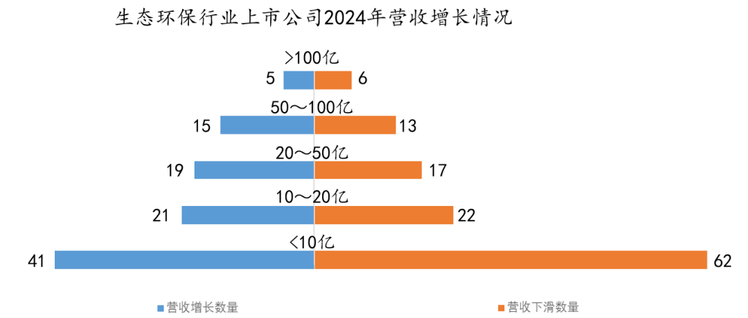 2024年生态环保行业上市公司总收入6128亿,相比于2023年的6192亿下降了1%,各大上市公司平均营收从2023年的28亿,下降到了27.7亿。从营收的变化趋势来看,行业总体呈现平稳状态。120家企业(54%)的收入下滑,101家企业(46%)的收入增长,基本呈现对半开的形态。